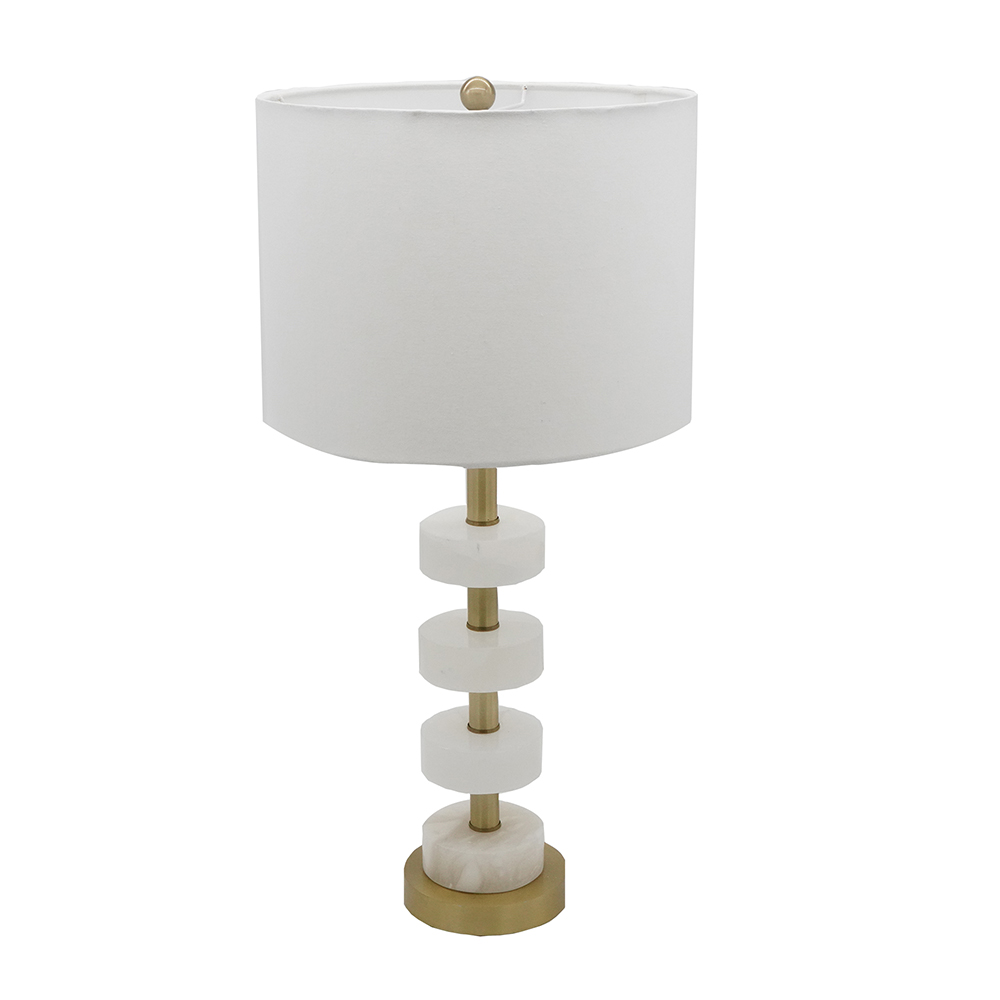 This table lamp incorporates a series of alabaster pieces with a brass metal frame and round base to create a vintage look with a modern flavor. To round out this look, this lamp features a matching white fabric drum shade that is topped with a brass finial. It achieves the ideal balance between modern and timeless, eye catching and subdued.