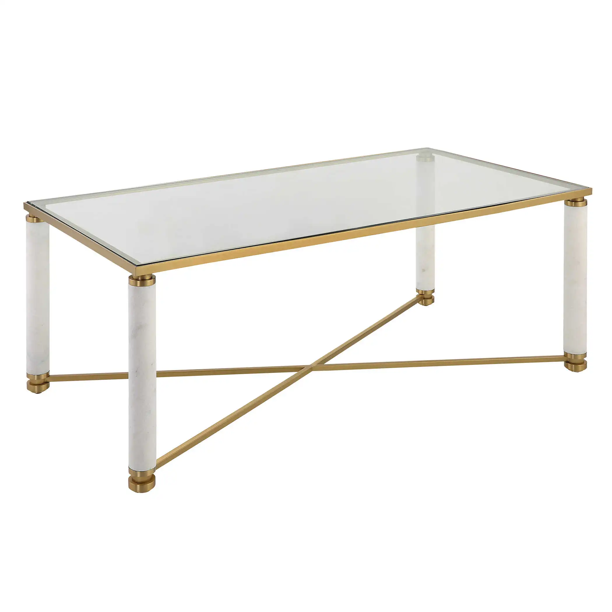 Sure to become a modern classic, this unique coffee table features white honed marble legs with interesting detailed feet and caps. Made of steel with a rich brass finish, it is completed with a 3/8″ thick clear, tempered glass top.